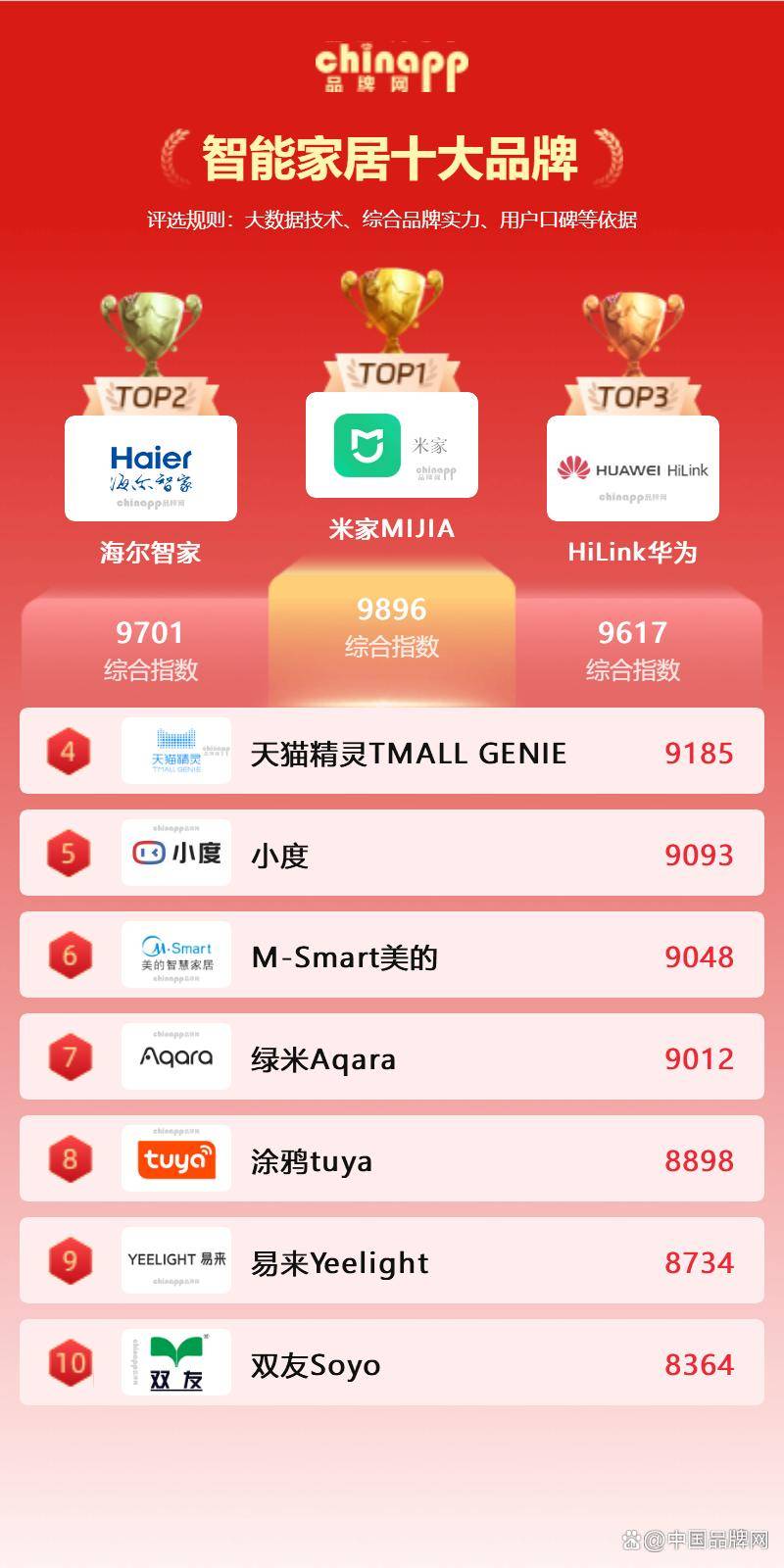 智能家居十大品牌排行榜,智能家居十大品牌前十名分别是:米家MIJIA、海尔智家、HiLink华为、天猫精灵TMALL GENIEIM体育官网入口、小度、M-Smart美的、绿米Aqara、涂鸦tuya、易来Yeelight、双友Soyo 。接下来,一起看一下最新智能家居十大品牌详细情况: